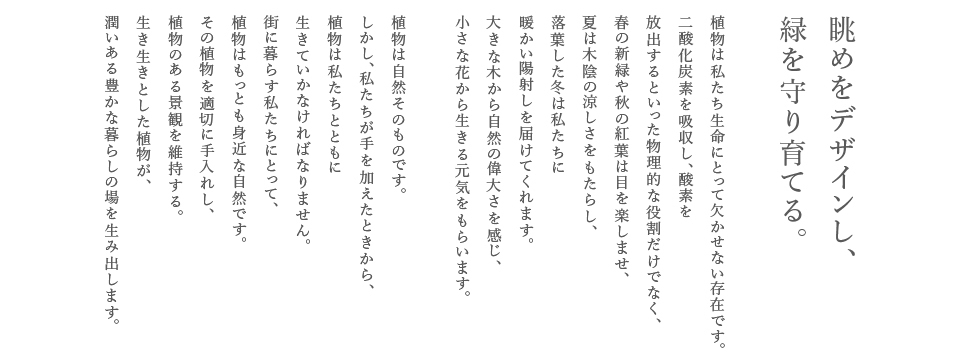植物は自然そのものです。しかし、私たちが手を加えたときから、植物は私たちとともに生きていかなければなりません。街に暮らす私たちにとって、植物はもっとも身近な自然です。その植物を適切に手入れし、植物のある景観を維持する。生き生きとした植物が、潤いある豊かな暮らしの場を生み出します。